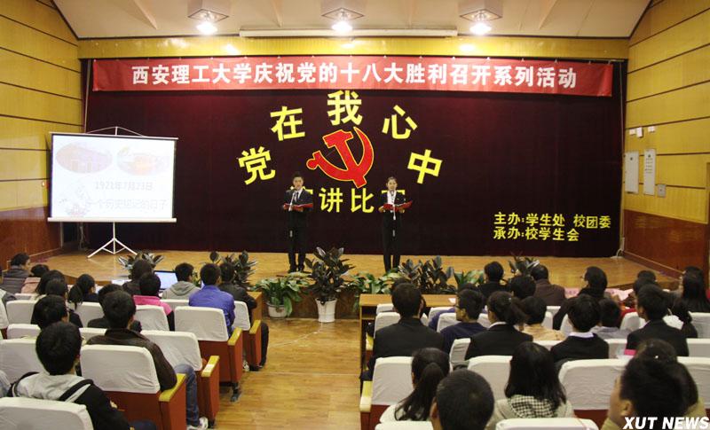 决赛在全场师生齐唱《没有共产党就没有新中国》的歌声中拉开序幕。选手们用豪迈的激情,抒发了对祖国、对党的无限热爱;用铿锵有力的声音,表达了对党崇高的敬仰,歌颂了党的丰功伟绩,表达了西理工学子对十八大胜利召开的祝贺、对党的热爱以及为国增光的壮志豪情。