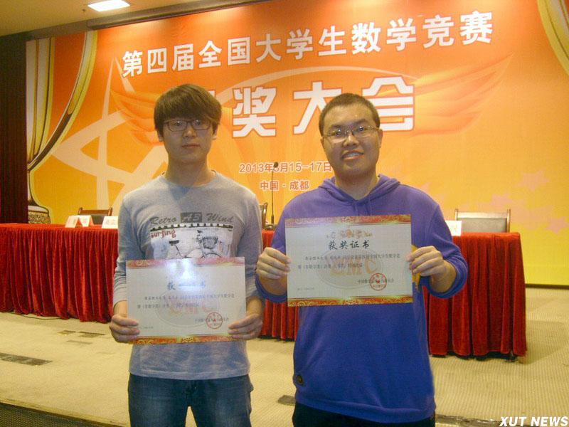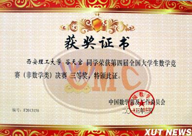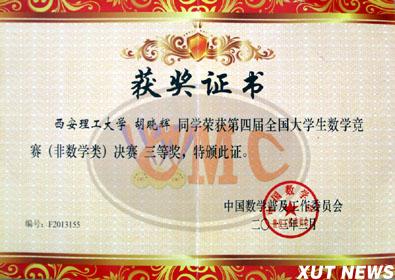 第四届全国大学生数学竞赛近日在电子科技大学举行,陕西省共派出包括我校在内的12人参加非数学专业类学生参加决赛。经过激烈角逐,我校学生胡晓辉、谷天宝分别获得全国三等奖,西安理工大学获得优秀组织奖。其中在2012年10月27日举行的第四届全国大学生数学竞赛预赛中,我校共有307名学生报名参加,45人预赛获奖,其中一等奖9人、二等奖14人、三等奖22人。