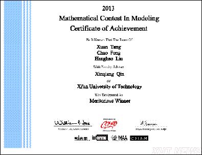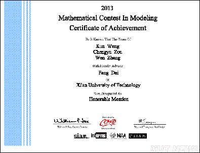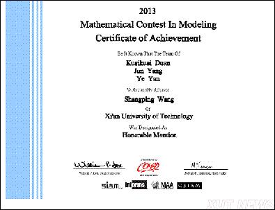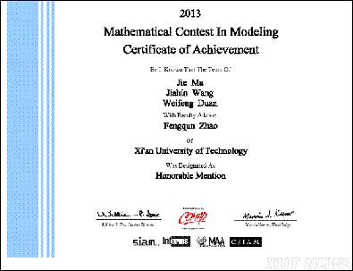 另外,在今年2月1日至5日举行的2013年美国大学生数学建模竞赛中,我校组织了四支队伍(12人)参赛,全部获奖,其中获得一等奖1项,二等奖3项,继去年获得3项二等奖之后的又一突破,为我校参赛以来获得的最好成绩。