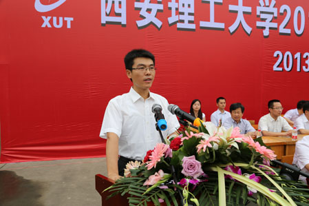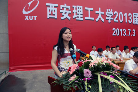 教师代表材料科学与工程学院游才印教授在发言中勉励毕业生秉承学校“艰苦奋斗、自强不息”的精神,满怀信心,有所作为;毕业生代表机械与精密仪器工程学院李源同学在发言中回顾了充实而美好的大学生活,代表2013届毕业生向母校表达了诚挚的谢意,并表示将用所学知识报效祖国,无愧于母校的培养。