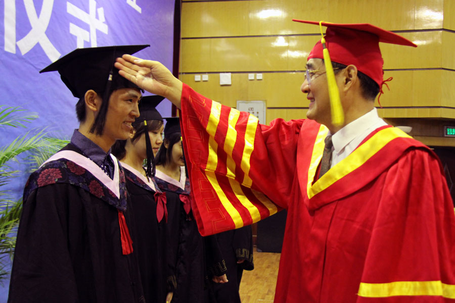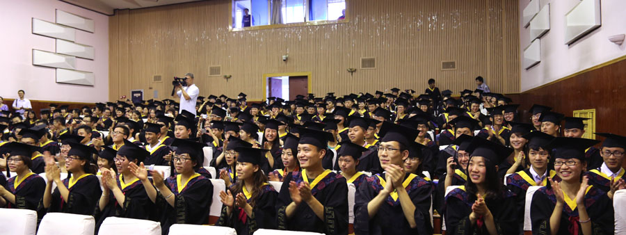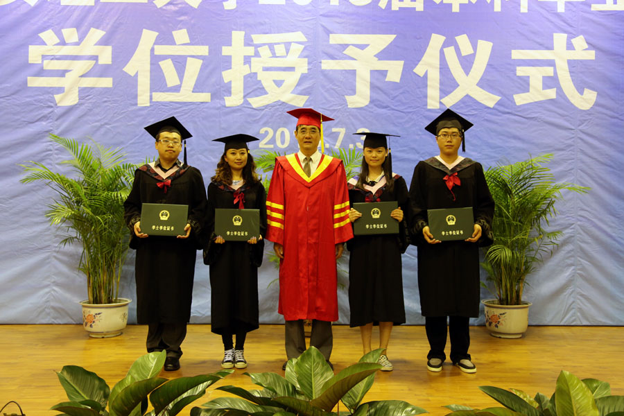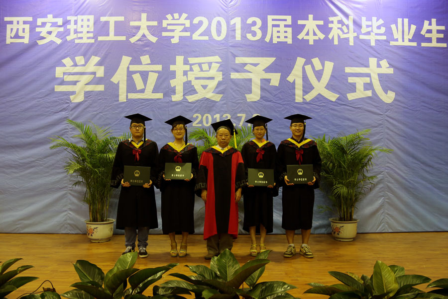 上午9时,2013届本科毕业生学位授予仪式开始。校学位评定委员会主席、校长刘丁教授,学位评定委员会副主席沈冰教授,学位评定委员会副主席、党委副书记刘凯教授分别为300余名2013届本科毕业生代表授予了学士学位证书。他们亲切地与毕业生交流、握手,并将他们学位帽上的流苏扶正,祝贺他们获得学位。学位授予仪式在庄重而热烈的气氛中圆满结束。