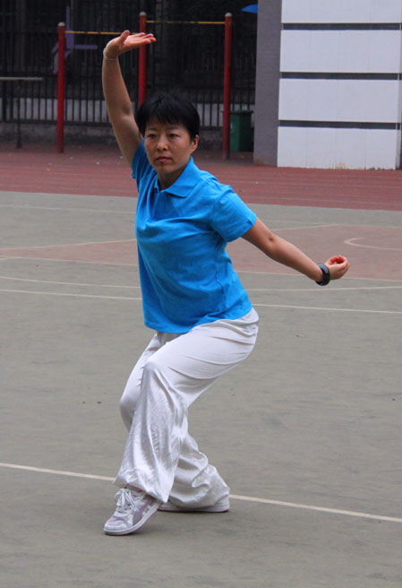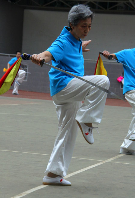 上午7时30分,展演在“杨氏24式简化太极拳”中拉开序幕。紧接着剑、刀、扇、舞等各种套路,表演接连不断,各展精妙,令人目不暇接。“长寿筷子”和“武舞功夫扇”颇具新意;“长拳”刚柔并济;“杨氏32式太极剑”整齐划一,11个汇报展演节目,精彩纷至,高潮迭起,现场观众不时报以热烈的掌声。演出在太极拳活动站和广场舞队合作的“扇子舞——祖国你好”中落下帷幕。