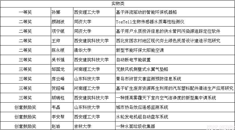 第八届全国环境友好科技竞赛2013年7月14日在上海同济大学隆重举行,西安理工大学获得了本次竞赛实物类唯一一项一等奖和一项创意鼓励奖。