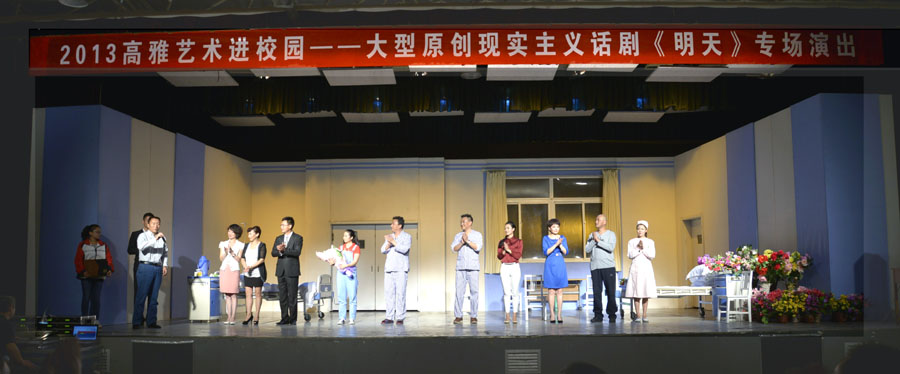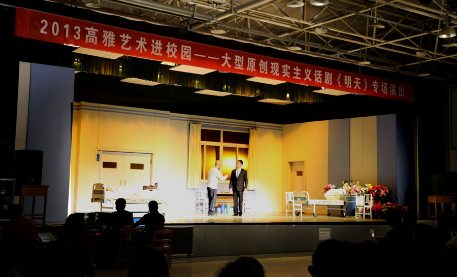 由教育部、文化部、财政部主办、陕西省教育厅协办的“2013高雅艺术进校园”9月23日进入西安理工大学,西安话剧院在曲江校区大学生活动中心演出了该院原创话剧《明天》。