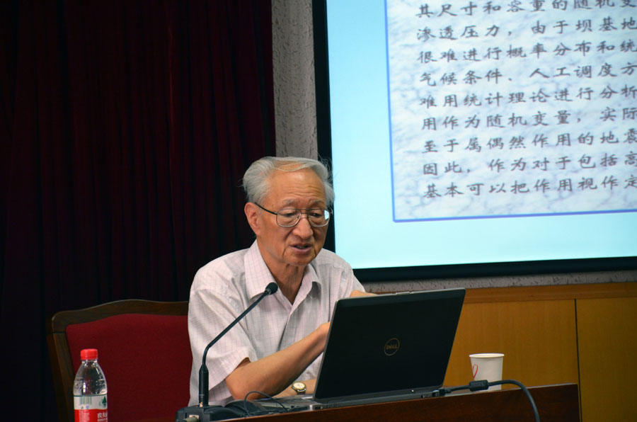 陈厚群院士的报告围绕水工建筑物的可靠性设计问题展开,从历史背景、发展历程等各方面阐述。同时,对于水工建筑物可靠度设计的优劣性以及《水工建筑物抗震设计规范》中的成功应用做了详尽介绍。陈院士的报告思路清晰、深入浅出,大师风范尽显,师生们听的津津有味。