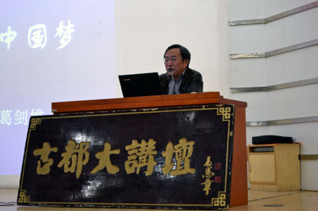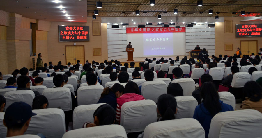 2013年10月30日晚,我校《古都大讲坛》第73讲报告会在曲江图书馆报告厅隆重举行。本次报告会特邀复旦大学图书馆馆长、教育部社会科学委员会委员、教育部学风建设委员会副主任、上海市图书馆学会副理事长、上海市历史学会副会长、上海市政府参事,全国政协常委葛剑雄教授作了“软实力与中国梦”的专题报告。
