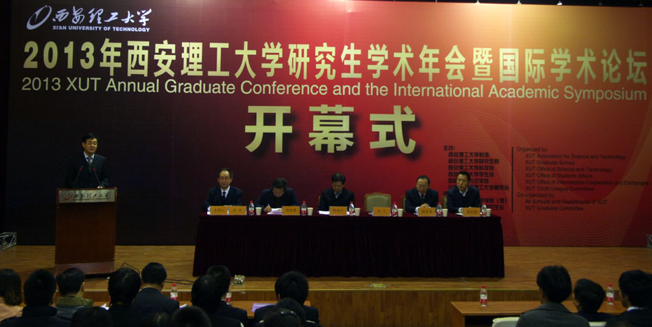 11月2日上午,以“启迪科学思维、拓展学术视野、促进国际交流、提升创新能力”为主题的2013年西安理工大学研究生学术年会暨国际学术论坛在我校金花校区图书馆报告厅隆重开幕。中国科学院院士舒德干教授,陕西省科协部长张晓黎,陕西省学位办公室副主任郝宵京,西安理工大学校长刘丁教授、副书记崔亦国、副校长李言教授出席,各学院和相关处室负责人及300余名研究生代表参加了开幕式。日本福井大学的教师和研究生代表、我校德国留学生代表以及新闻媒体代表应邀参加了开幕式。