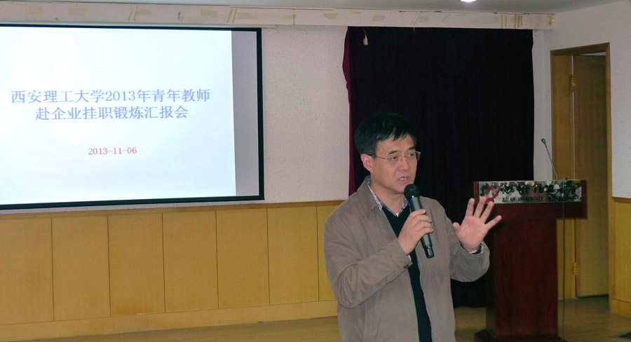 西安理工大学2013年青年教师赴大型企业锻炼报告会于11月6日在科技报告厅召开,3位赴吴江经济技术开发区和2位赴中国东方电气集团有限公司挂职锻炼的青年教师代表在会上介绍了各自在企业学习锻炼的收获与体会。校长刘丁、人事处处长赵高扬以及新进校青年教师和2014年赴大型企业锻炼的青年教师参加了报告会。人事处副处长高建新主持报告会。