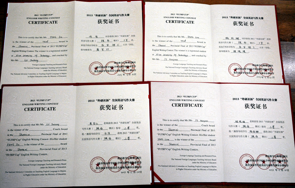 2013年“外研社杯”全国英语写作大赛陕西赛区复赛11月10日在西安电子科技大学新校区举行。西安理工大学人文与外国语学院学生冯佳和杨丽娜均获得了三等奖。教师鹿军红和姬晓媛分别获得了写作大赛指导三等奖。