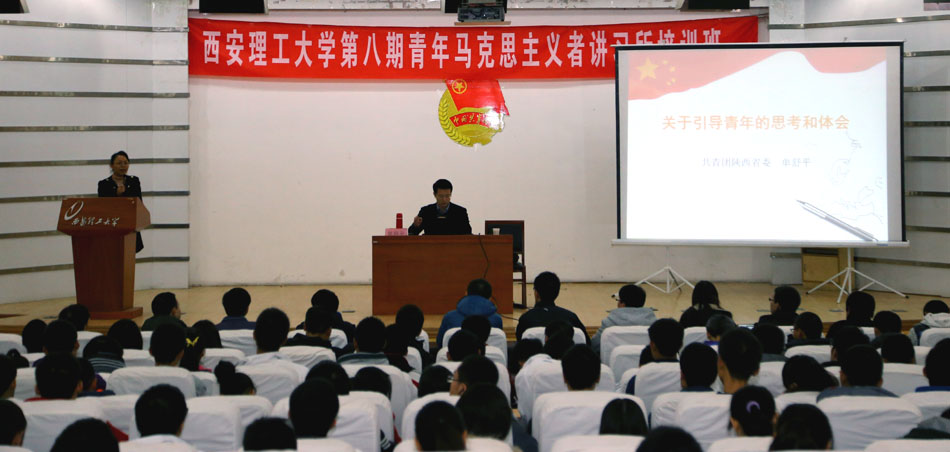 第八期青年马克思主义者讲习所培训班自今年10月开班后,已先后邀请了校党委周孝德书记、思政教学部主任鲁宽民教授、《长安夜话》节目主持人力闻分别就党的历程、民族的伟大复兴、青年干部的成长成才等青年人最关心的时政热点话题做专题报告。同时在培训班中举办实践活动,多次与鑫龙天然居社区联合开展了文明祭祀志愿服务宣传、“119”防火宣传等活动,活动受到西安日报、陕西传媒网、新浪校园等媒体的广泛关注。