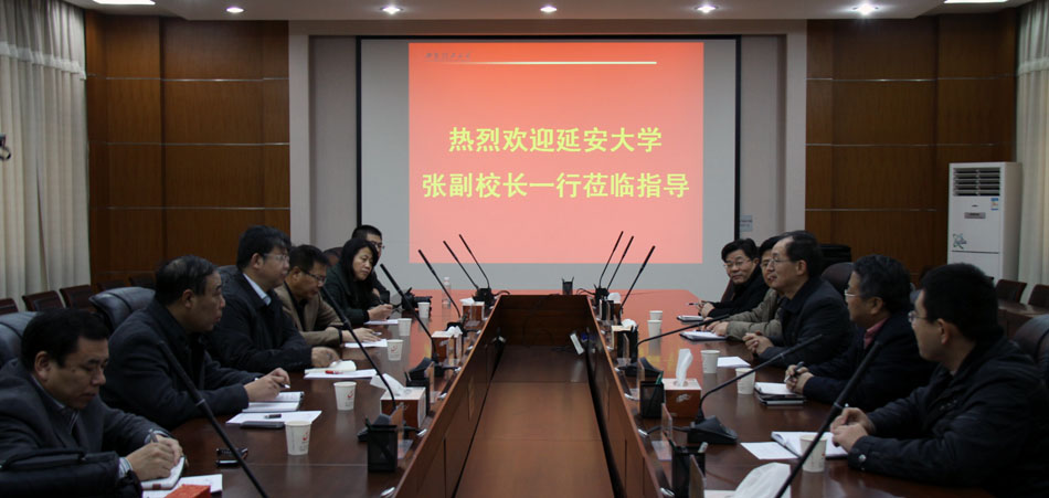 2013年12月4日,延安大学副校长张威虎一行来我校调研后勤工作,李言副校长代表学校对张副校长一行表示欢迎,并介绍了我校的基本情况。