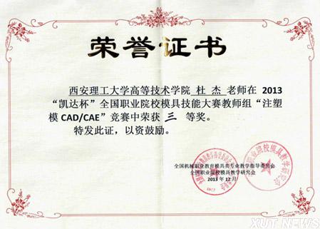 我校高等技术学院机电系学生组成的代表队参加学生组注塑模CAD/CAE/CAM项目比赛获三等奖;机电系教师杜杰参加教工组注塑模CAD/CAE比赛获个人三等奖。