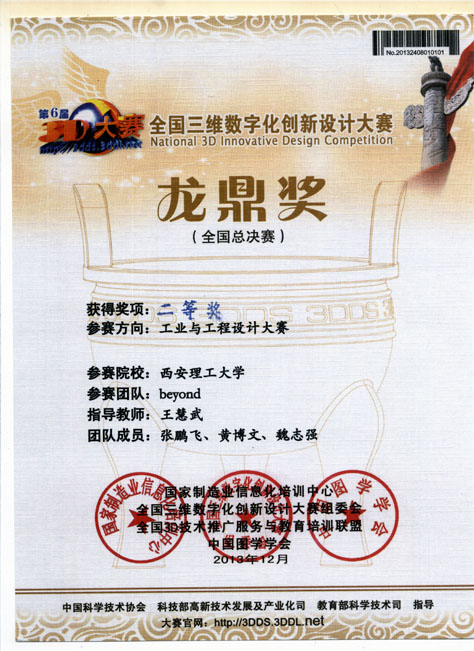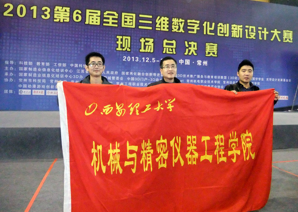 2013第六届全国3D创新设计大赛总决赛于12月5日~8日在江苏省常州市举行,400多个团队参加全国现场总决赛,我校代表队获全国二等奖。