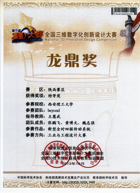 我校由教师王慧武指导的beyond队参赛作品为“新型全时四驱传动系统”,在获得了陕西赛区特等奖之后参加了全国总决赛,受到专家评委的好评。由机械与精密仪器工程学院组成的4个参赛团队经初赛、复赛、陕西赛区决赛,共夺得陕西赛区特等奖1项、一等奖2项、二等奖1项、网络人气奖1项。