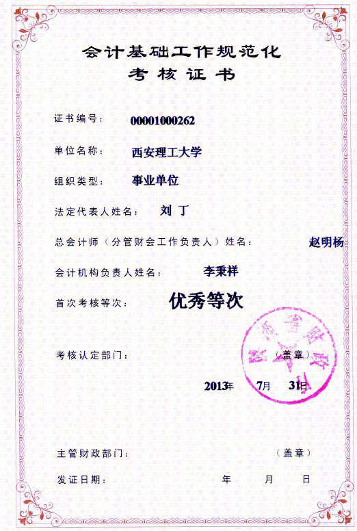 根据陕西省财政厅《关于下达陕西省教育厅会计基础工作规范化考核意见书的通知》(陕财办会〔2013〕38号),经过实地考核和评议,我校会计基础工作规范化被陕西省财政厅考核为“优秀”。