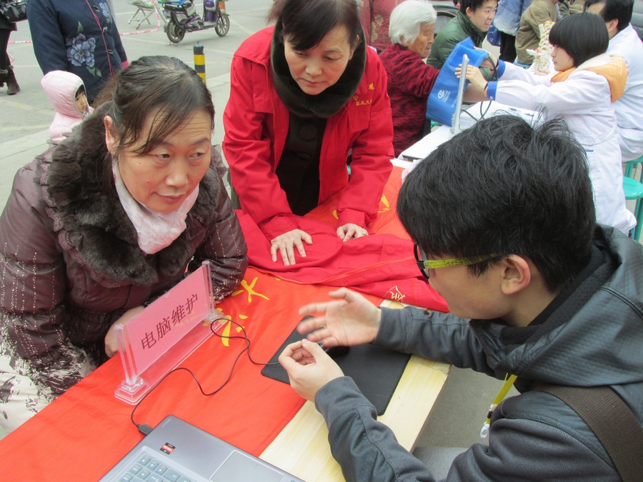 在鑫龙天然居社区,西安理工大学水电学院的志愿者们开展了电脑维护服务活动。活动中,志愿者们对前来咨询电脑、手机或其他电子产品方面存在问题的小区居民进行耐心细致的讲解,帮助社区居民解决电脑运行慢、死机、病毒以及手机应用软件的使用方法等,共为200余位居民提供了帮助。共青团陕西省委副书记单舒平也来到活动现场和志愿者们交流了志愿服务方面的工作,他希望志愿者们能以此活动为契机组成固定的电脑服务队,为社区长期提供志愿服务。