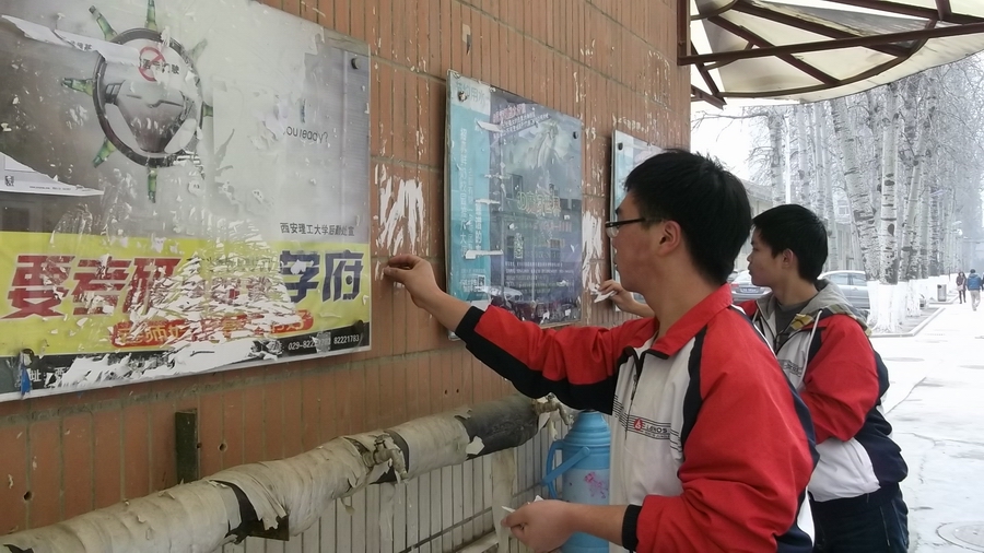 在校园里,西安理工大学高等技术学院、印包学院的志愿者们开始了清洁校园行动,同学们一起拿起铲子、刷子、抹布等工具对校园内的小广告进行清理,并号召更多的同学一起抵制各类张贴、喷涂的小广告,发挥各自的力量为校区环境的整洁做贡献,校园里弥漫着雷锋精神的气息。
