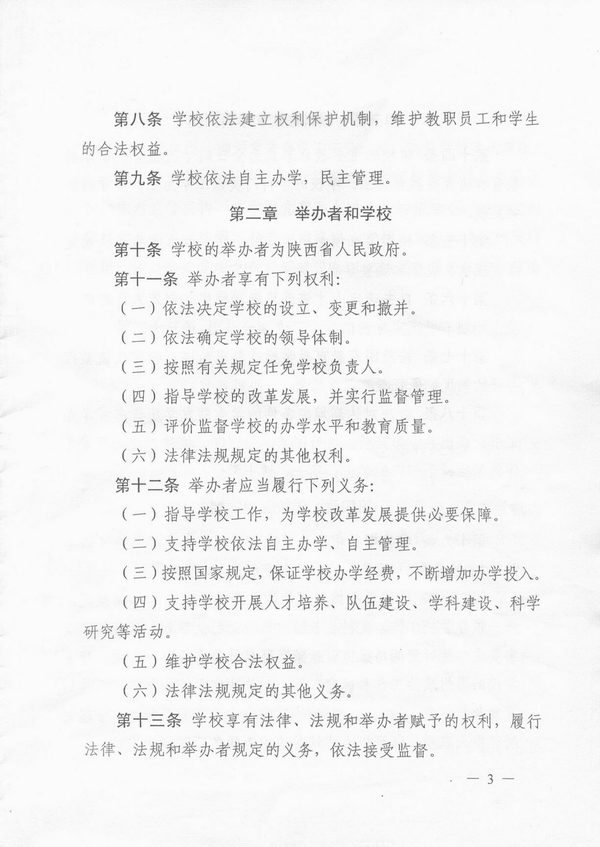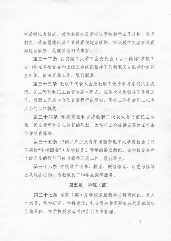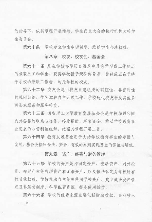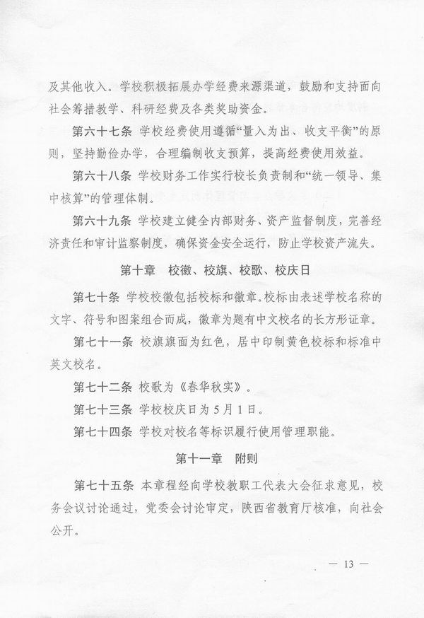 建立和完善学校章程,实现学校依法自主办学,是《教育法》、《高等教育法》赋予学校的一项基本权利,也是依法治校、建立现代大学制度的一项重要内容。随着依法治校进程的加快,制定和完善学校章程已成为高等学校面临的迫切任务。2012年初,陕西省教育厅决定在全省范围内开展高校章程修订工作,我校入选首批开展试点工作的10所高校之一。3月,我校成立了由刘丁校长任组长的章程制定工作领导小组,正式启动我校章程制定工作。6月,章程起草小组完成章程草案初稿,其后,在全校范围内征求意见,先后召开了干部座谈会、教授座谈会、专家座谈会、教职工座谈会、民主党派座谈会、校友座谈会、学生座谈会等各层次会议;8月,章程草案第二稿修改完成;9月,章程草案进行网上公开征求意见,并在此基础上形成第三稿;10月,经学校党委常委会审定,章程报送陕西省教育厅核准。其后,根据陕西省高等学校章程核准委员会提出的核准意见,又经多次修改后,于2014年3月3日由陕西省教育厅发文正式予以核准。