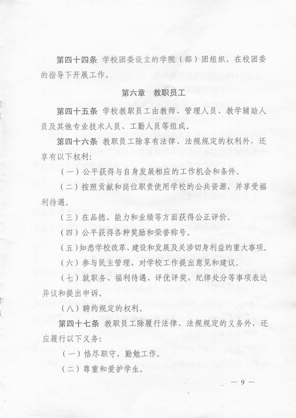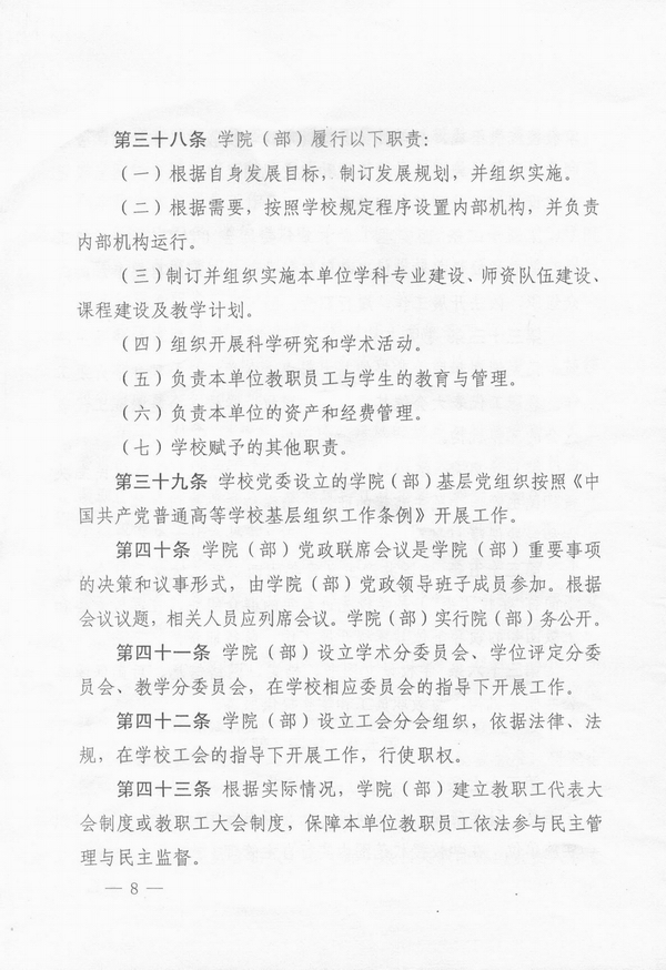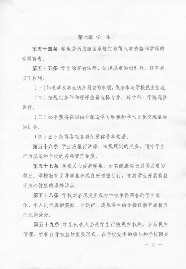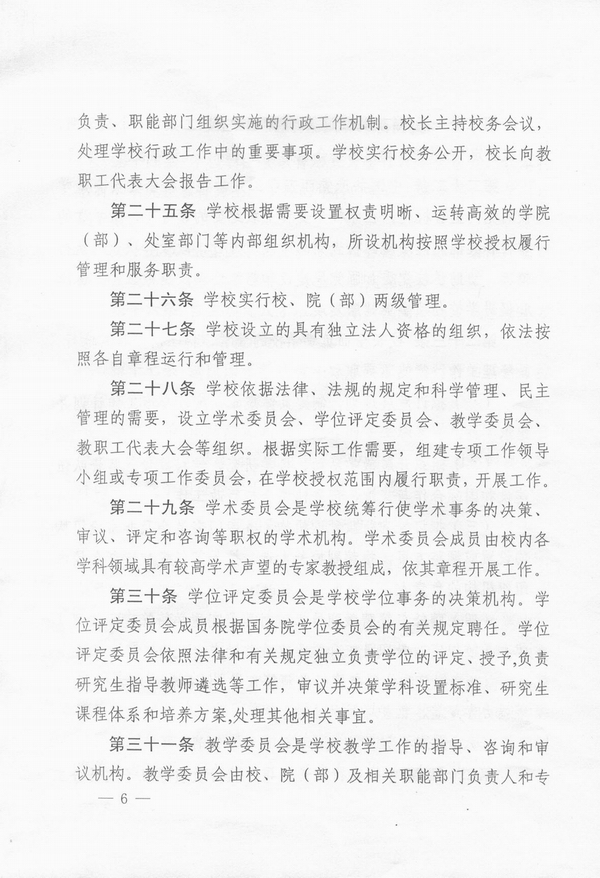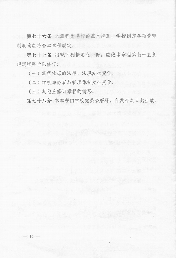 我校章程制定工作以“严谨、规范、简洁、明确”为原则,在充分调研、多方参考、广泛征询、集思广益的基础上,历经多次增删修改,最终《章程》成文共5500多字,分11章78条,包括总则,举办者和学校,教育形式和学科门类,学校管理体制,学院(部),教职员工,学生,校友、校友会、基金会,资产、经费与财务管理,校徽、校旗、校歌、校庆日和附则等11项内容。