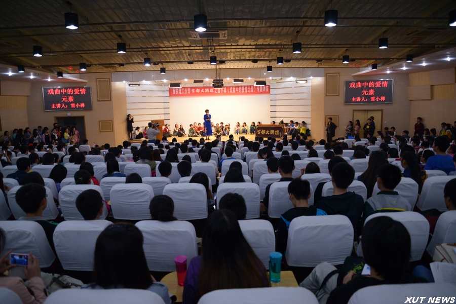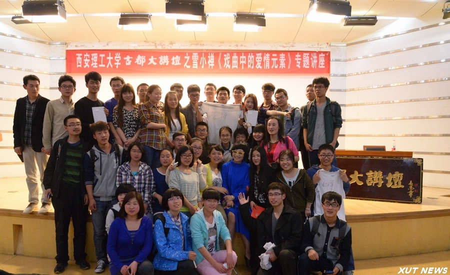 讲座中,雪小禅与现场学生进行了互动,一一回答了现场学生的提问。互动环节中,雪小禅与我校学生一同演唱了京剧《武家坡》选段,博得现场观众的阵阵掌声。