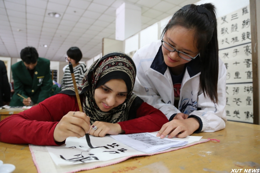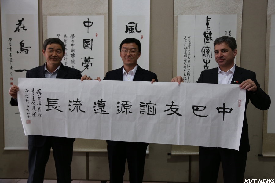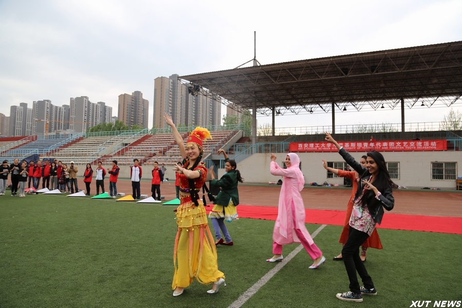 座谈会后,巴基斯坦青年代表团参观了工程训练中心,与我校青年学生开展了文艺交流活动。在观摩艺术与设计学院的书法课时,巴方青年拿起毛笔,学习中国书法。艺术与设计学院的师生书写了“中巴友谊源远流长”赠送巴基斯坦青年代表团,巴方青年代表团团长书写了“中巴友谊万岁”赠送给我校。在“绘衫秀”活动,双方青年共同绘制了象征中巴友谊的图案。在曲江校区田径场,中巴青年进行了文艺联欢活动,观看了我校学生航模队飞行表演。