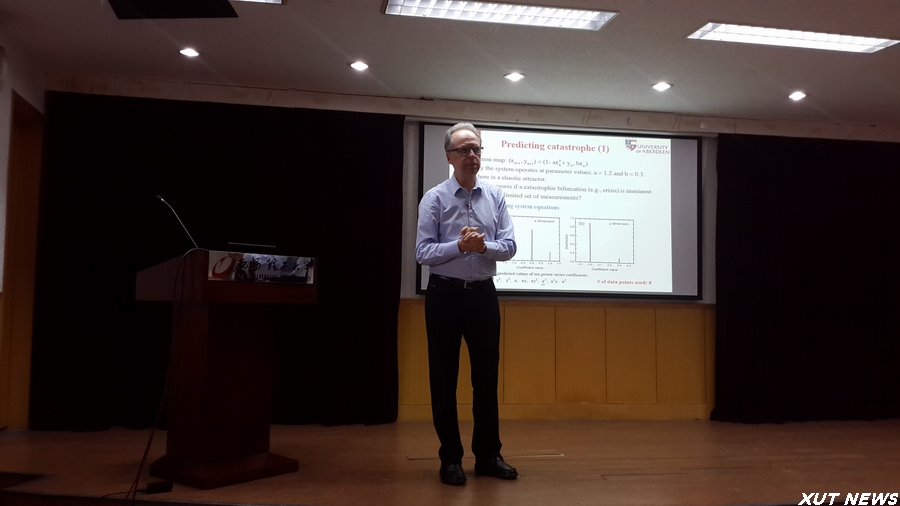 2014年5月16日上午,在教学六楼十二楼科技报告厅举行了我校荣誉教授英国阿伯丁大学Grebogi Celso教授学术报告会。报告题目为“基于时间序列的非线性系统和复杂网络辨识”。报告结合Celso教授及其合作者在Physics Review Letter上发表的最新文章展开,详细介绍了基于压缩感知非线性系统和复杂网络隐节点辨识方法。报告会由自动化学院任海鹏教授主持,来自西安交通大学和我校师生近百人参加了报告会。