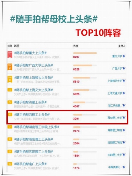 活动开展以来,得到了包括上海交通大学、重庆大学、中国传媒大学等全国50所高校的支持参与。在为期一个月的时间里,活动受到了3858.5万微博用户的关注,有12.9万人参与了活动讨论。我校官方微博自发布活动通知以来,先后有272位粉丝参与讨论,发布了数百张校园照片,约有7.4万人次阅读了这些照片内容。经官方统计,我校官方微博在此活动的参与热度为3091,在最后的子话题排行榜中位于全国第六位。
