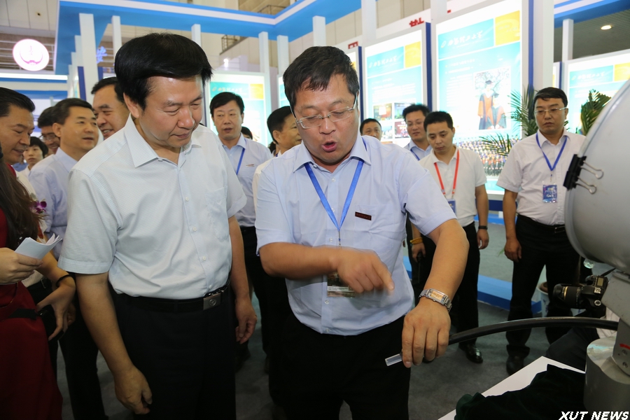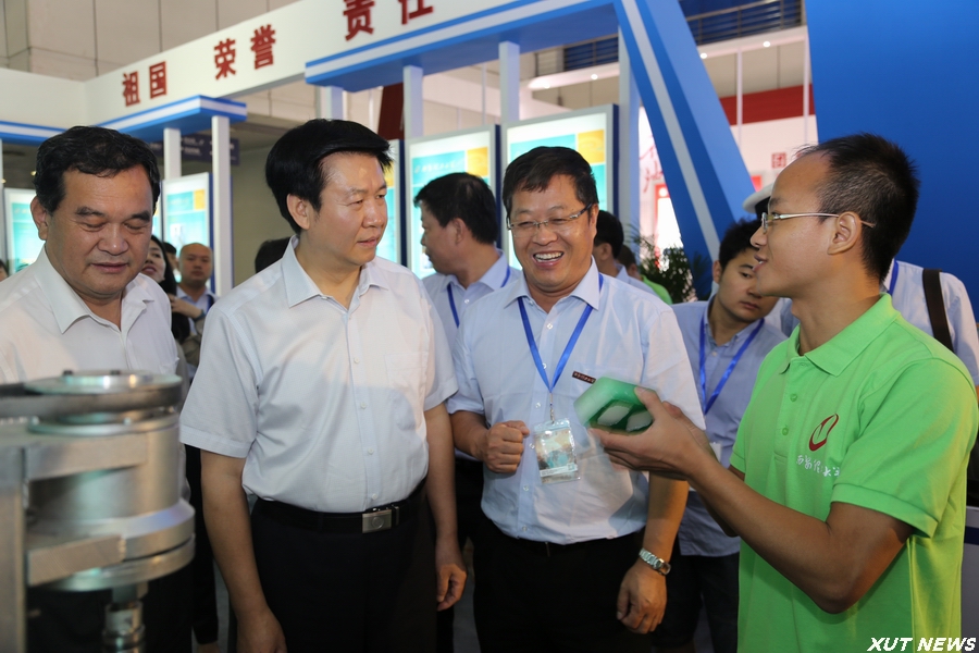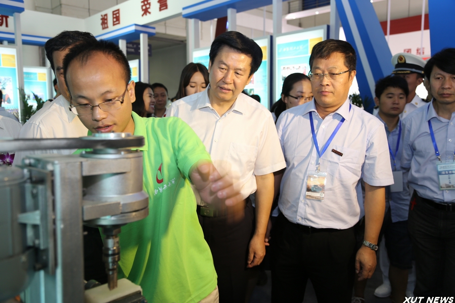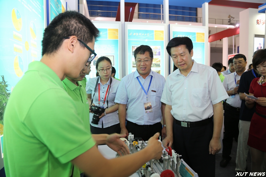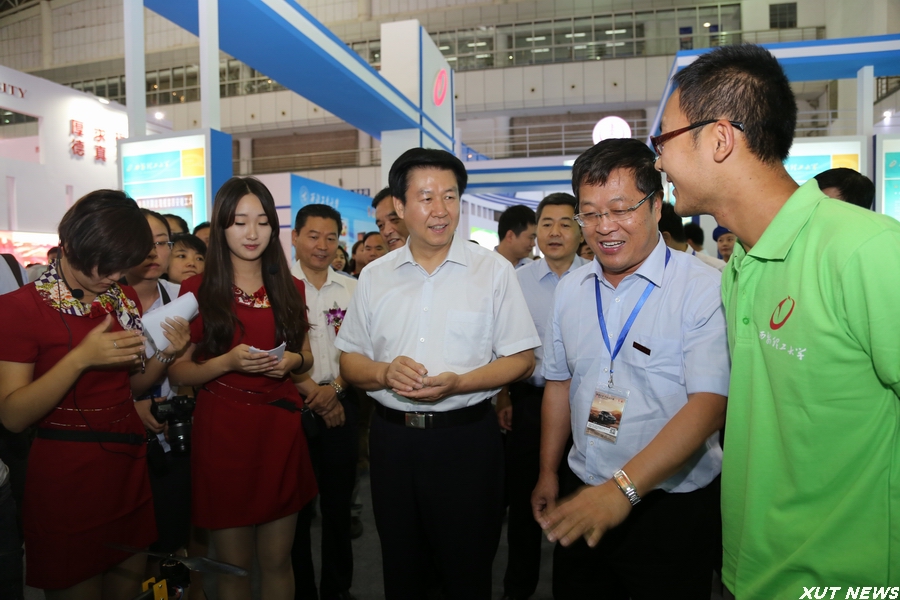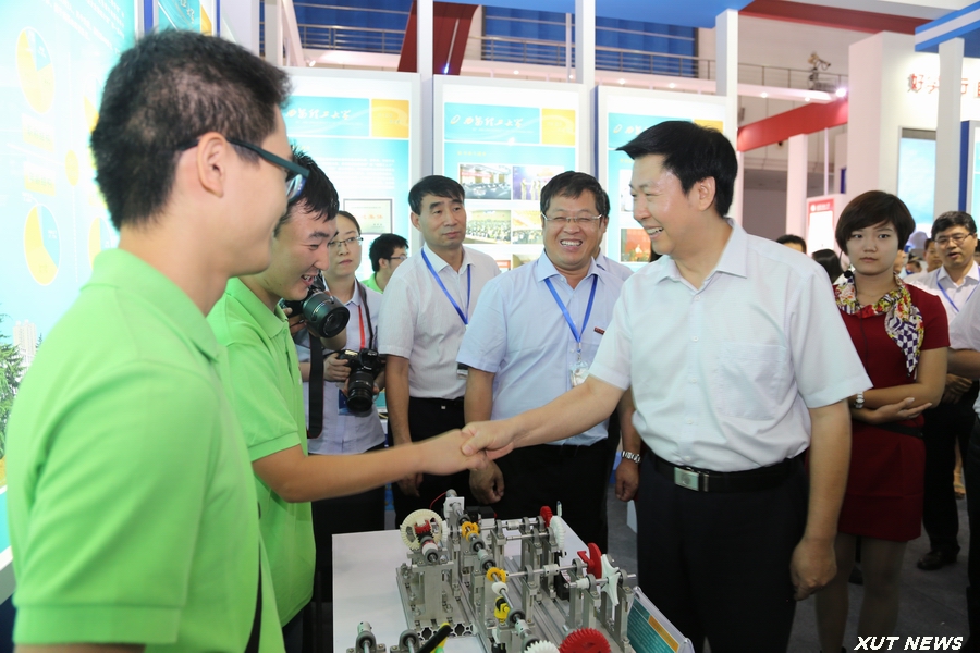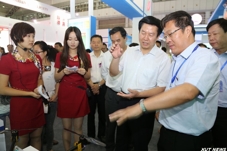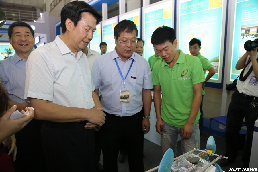 开幕式后,在有关人员的陪同下,庄长兴副省长一行参观了博览会现场。在我校展位前,周孝德书记向庄长兴副省长详细介绍了现场展出的我校多件学生科技创新作品,基于行星传动原理的非数控正多边形孔钻削装置、“智飞”空中智能机器人、传动系统创意组合演示平台、机械鱼等等,一个个精心设计、充满未来感的科技作品吸引了领导嘉宾的驻足观看。