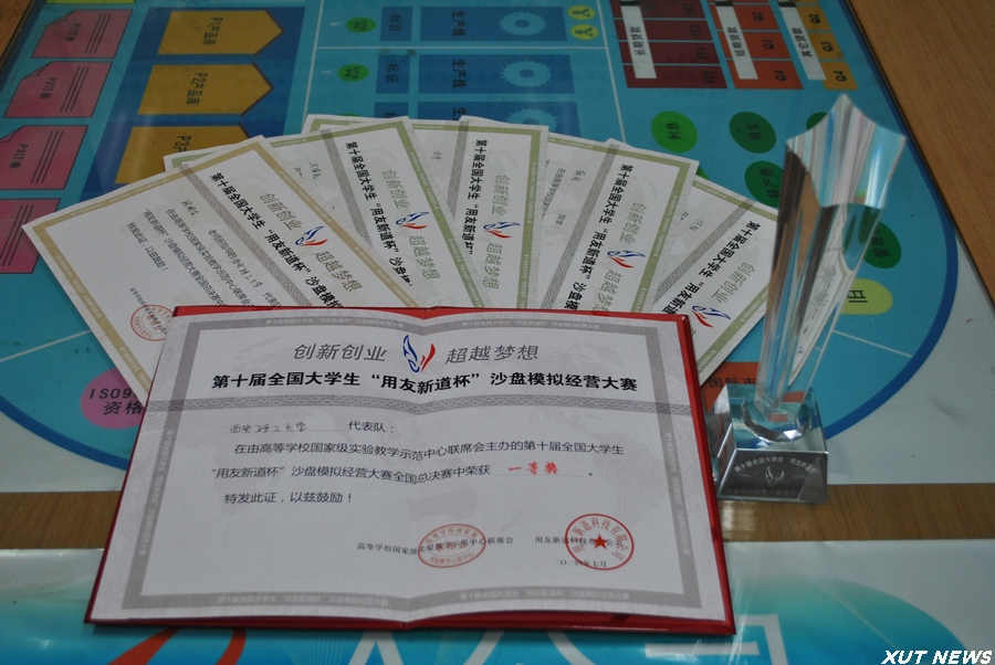 我校经济与管理学院的学生孙钰超(工程112)、田宇(信管111)、何阳(工程112)、薛刚(经济121)、冯泽武 (管121)五位同学组成的经济与管理学院代表队在段刚龙老师的指导下,经过了三个多月紧张辛苦的备战,在比赛中发扬不怕强手、敢打敢拼的精神,科学决策、精细管理顺利完成六年的企业经营,取得了全国总决赛一等奖的好成绩。创造了我校在该项赛事历届最好的成绩,为学校争得了荣誉。