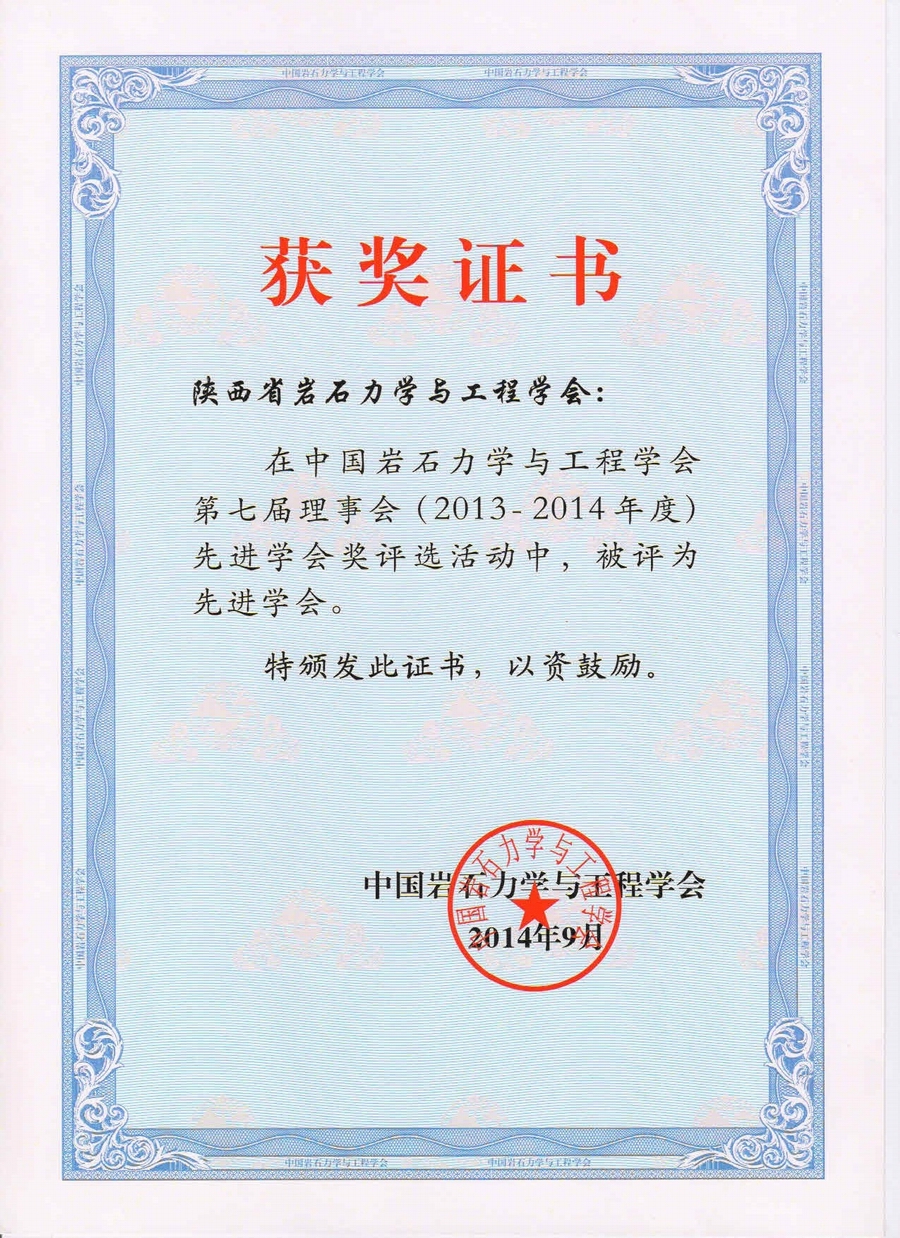 9月22日,2014年中国岩石力学与工程学会颁奖典礼在山西太原举行,根据中国岩石力学与工程学会第七届理事会(2013—2014年度)“先进学会”、“优秀个人”奖的奖励决定,挂靠在西安理工大学的陕西省岩石力学与工程学会被授予中国岩石力学与工程学会“先进学会”奖。