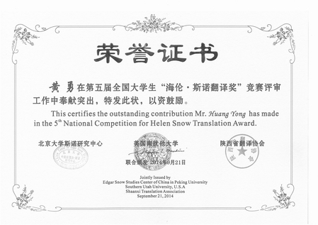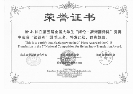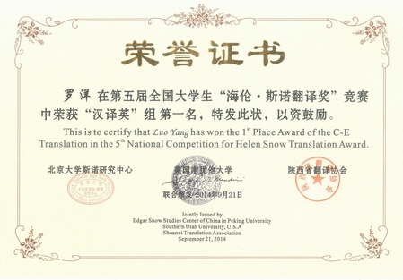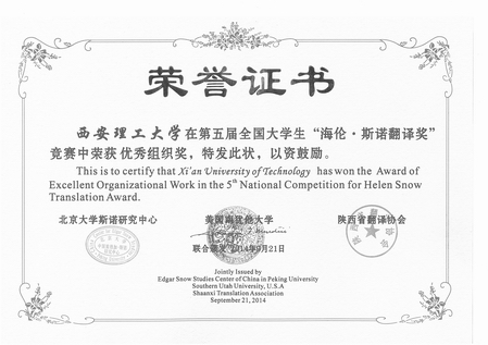 日前,由中国国际友人研究会、北京大学“中国埃德加斯诺研究中心”﹑美国南犹他大学和陕西省翻译协会共同主办的全国第五届“全国大学生‘海伦•斯诺翻译奖’大赛” 顺利落下帷幕。西安理工大学人文与外国语学院罗洋荣获汉译英一等奖(全国第一名),土木建筑工程学院徐小钰同学获得本次大赛汉译英三等奖,人文与外国语学院黄勇老师获得突出贡献奖,我校获得优秀组织奖。