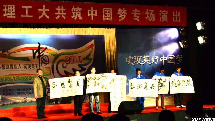 演出结束前,校团委书记田小平代表学校向西安残疾人联合会、碑林区残疾人联合会赠送了锦旗;碑林区残疾人艺术团向我校赠送了残疾人书画家现场书写的作品。