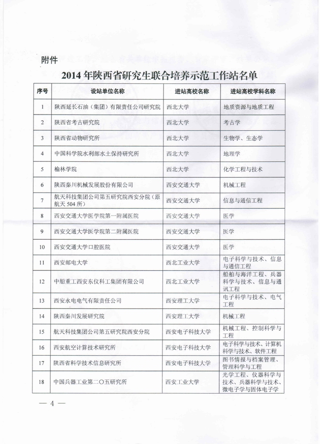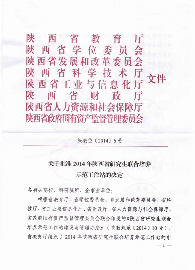 陕西省教育厅于2014年7月组织了陕西省研究生联合培养示范工作站的申报与评选工作。经各有关单位申报推荐、专家评审、结果公示、审定批准等程序,我校电子科学与技术学科(设站单位:西安永电电气有限责任公司)与机械工程学科(设站单位:陕西秦川发展研究院)申报的2个研究生联合培养实践基地被评为陕西省研究生联合培养示范工作站,成为全省33个首批示范工作站之一。