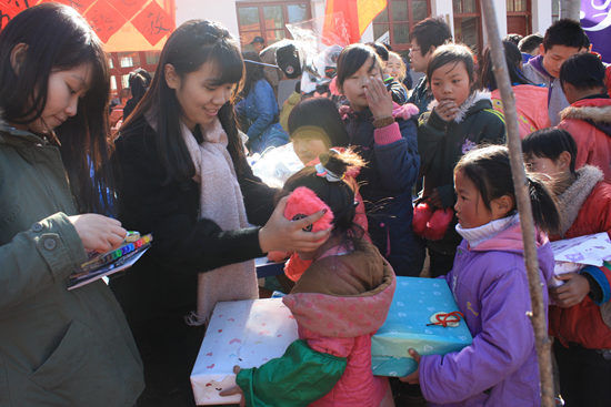 满载着为贫困山区小朋友们特别准备的物资和35份装着孩子们新年心愿的鞋盒礼物,来自四所高校的志愿者们和爱心车队一起来到蓝田县梁家扁小学。在简单的交接仪式后,志愿者为孩子们一一分发礼物,并与小朋友们一起唱歌做游戏,一张张稚嫩的小脸上洋溢着幸福的笑容,气氛欢快而融洽。活动在欢声笑语中圆满结束。