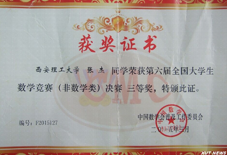 3月20日至22日,第六届全国大学生数学竞赛决赛在华中科技大学举行,我校自动化与信息工程学院电子112班张杰同学获得非数学类全国三等奖。我校107名学生在陕西赛区预赛中获奖,其中省一等奖21项、省二等奖33项、省三等奖53项。