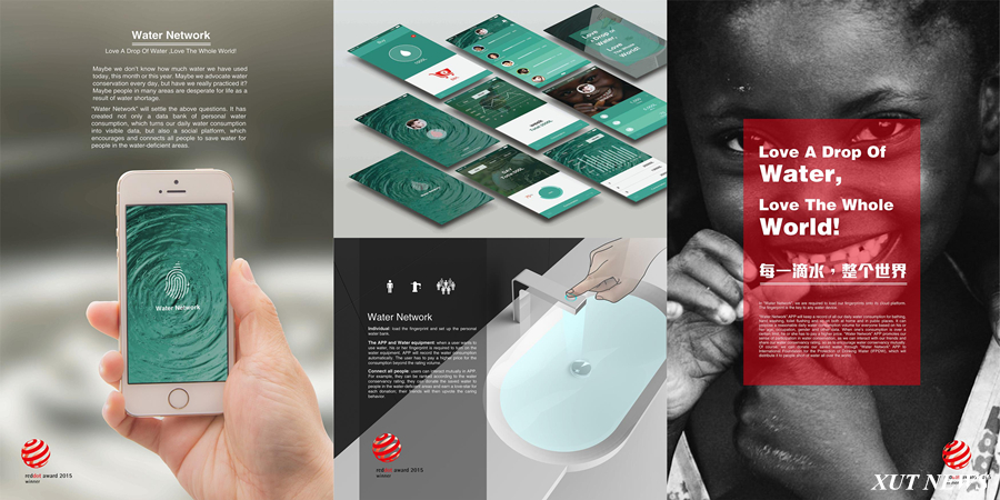 获奖作品《Water Network》由博士生朱兆华、博士生导师吉晓民教授和硕士生导师高瞩教授、硕士曹冰一、李翠翠合作完成。作品不仅创建了支持个人存储用水量的数据银行概念,还提出了将人们每天的用水量进行数据化、可视化,建立一个激励人们去节约用水的社交平台,号召全球人一起来节约用水,最终将节省水资源派送给缺水地区人们的理念。“Water Network”各终端可将人们的指纹上传于“Water Network”云平台,个人指纹成为打开一切水设备的钥匙。“Water Network”APP可以实时记录人们日常用水量,基于年龄、职业、性别等数据科学调配每人每天的合理用水量,实现峰谷不同价政策;提升人们节约用水的参与感,强化人们相互间的情感互动;可向国际水资源保护组织(IFPDW)进行水资源捐赠,带给现代人无限的可能性。