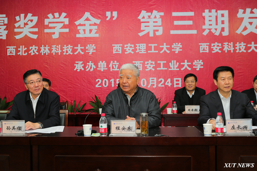 10月24日上午,“晨露奖学金”第三期发放仪式在西安工业大学未央校区隆重举行。“晨露奖学金”项目出资人、陕西省原省长程安东出席仪式并讲话。陕西省副省长庄长兴、省政府副秘书长胡保存、省委高教工委书记李仲为、省教育厅厅长李兴旺等出席发放仪式。我校党委书记周孝德和西北农林科技大学、西安科技大学、西安工业大学等三所合作高校领导出席了发放仪式。
